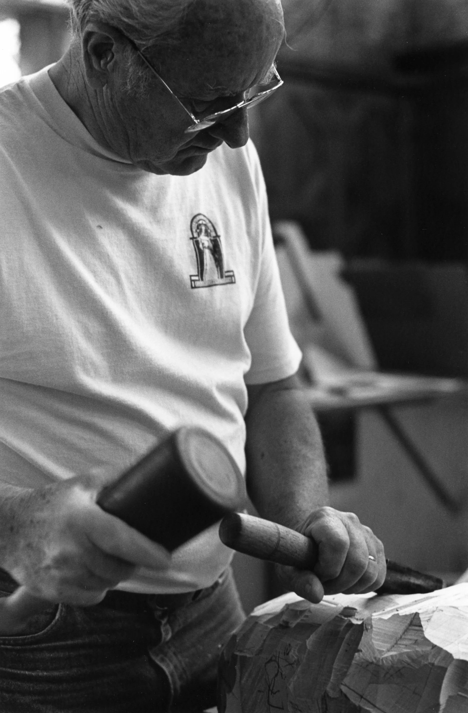 Wilbure Rubottom hand carving the Juniperro Serra statue